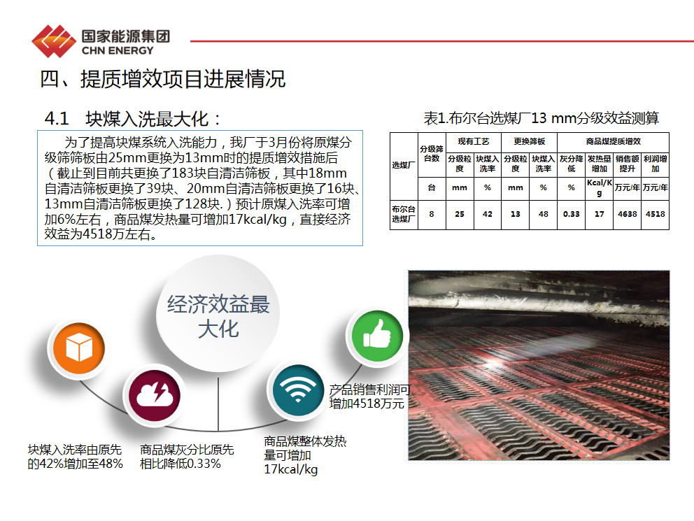 布爾臺洗煤廠原煤水大,經(jīng)常造成篩板堵篩,后來用了高效自清潔篩板,徹底解決堵篩問題,并將原傳統(tǒng)篩板25mm分級降低至13mm分級的高效自清潔篩板。同時采購了一批10mm的高效自清潔篩板,計劃每臺篩機除了安裝13mm篩板以外,安裝兩排10mm高效自清潔篩板。以爭取取得更好的各項經(jīng)濟技術指標和效益(附報告截圖)。
